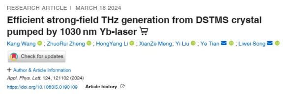 近期,中國科學院上海光學精密機械研究所強場激光物理國家重點實驗室在基于Yb激光泵浦有機晶體產生強場太赫茲波方面取得新進展。相關研究成果以 “Efficient strong-field THz generation from DSTMS crystal pumped by 1030nm Yb-laser” 為題發表在Applied Physics Letters上。