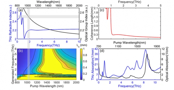 圖2. 激光-太赫茲波相位匹配 (a)DSTMS晶體在紅外波段和太赫茲波段的折射率;(b)太赫茲頻率、相干長度等與泵浦激光波長的依賴關系;(c)泵浦激光波長為1030 nm時的太赫茲相干長度;(d)DSTMS晶體在紅外和太赫茲波段的吸收特性。