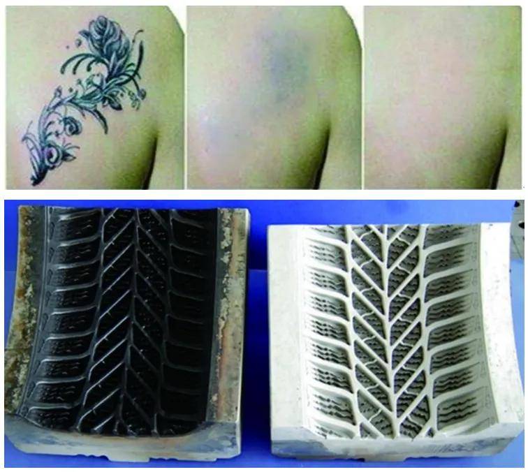 (5)其他方面:以往在醫療領域中,人們經常使用化學藥劑來清洗患者的紋身,但是,這種方法不僅不能徹底清除掉皮膚上的色素,而且會損害皮膚的健康,甚至還會留下疤痕或產生炎癥。但采用激光清洗技術對患者的紋身進行清洗時,激光只會對皮膚表面產生輕微的燒灼作用,并不會對患者的皮膚造成嚴重傷害,皮膚內部的色素微粒將被激光傳送的能量粉碎,然后通過細胞自身的代謝過程可被完全分解,如圖所示。激光清洗的范圍還在不斷擴大,目前已用于海面泄露石油、發動機積碳、城市涂鴉、牙齒、生物戰劑、毒劑等。