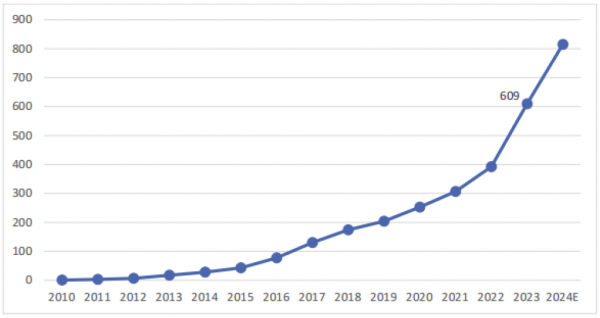 2010-2023年全國太陽能光伏發(fā)電裝機累計容量(單位:GW)(數(shù)據(jù)來源:中國光伏行業(yè)協(xié)會CPIA)