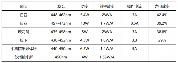 1994年赤崎勇和天野浩教授首先報道了基于氮化鎵雙異質結構。1996年日本日亞公司中村修二領導的科研團隊研制出世界上第一支GaN基紫光激光器。2014年,氮化鎵基LED的發明者赤崎勇、天野浩和中村修二教授被授予當年的諾貝爾物理學獎。目前大功率藍光激光器主要采用倒裝結構以降低其熱阻。國際上日本日亞公司和德國歐司朗公司報道了斜率效率2 W/A的藍光激光器,在良好散熱封裝的條件下單管輸出光功率均達到5W以上。