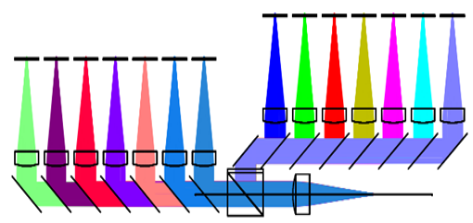 激光合束是一個將多束單元激光耦合成一束的過程,它基于半導體激光的相位、光強、偏振及光譜等特性,利用光學元件的折射、反射及衍射效應,改變或不改變激光單元的振蕩特性,來提高輸出功率、增加激光亮度及改善光束質量。非相干合束是目前實現高功率半導體激光輸出的主要方式,可以根據合束光源的譜寬及合束單元的波長間隔作為區分。