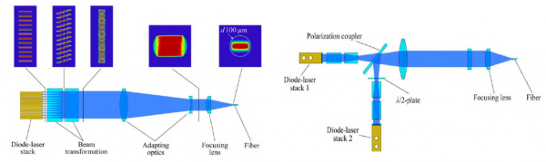 疊陣合束光源基于微通道水冷疊陣,采用高功率厘米激光巴條,需先對光斑整形后才能合束,單層激光疊陣輸出功率可達50-75W,采用數十層疊陣合束,可實現數百瓦至上千瓦功率從300~800μm光纖輸出,也可作為直接光源應用。通過波長擴展,可將功率提升至更高。德國Laserline公司在該技術領域具有優勢,采用高亮度的激光bar, 通過棱鏡堆光束整形,推出了500到4KW激光器產品。