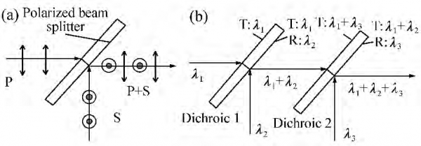 采用激射波長相同或相近的激光單元進行光束整形,空間合束、偏振合束以及光纖合束,是多個不同波長激光合束的基礎。空間合束是將多束激光空間堆疊,增加功率的同時光束質量變差; 偏振合束利用半導體激光線偏振特性,將兩束振動方向相互垂直的光束通過偏振合束鏡,實現光束重合的方式輸出,功率提高近一倍,光束質量不變。