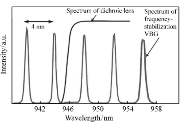 常規合束方式的相鄰波長間隔很難于25 nm,在430nm到492nm藍光波長,采用粗波長合束,合束波段最多不超過3線。考慮合束過程中的損耗以及430nm、490nm附近的芯片效率損耗,激光功率及亮度提升有限。因此采用密集光譜合束,是藍光半導體激光提高輸出亮度的一條可行的路徑。