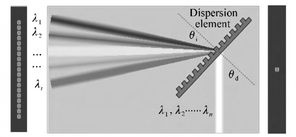 光譜合束技術利用單片色散元件可同時實現多束波長間隔低至 0. 1 nm的激光合束,進一步提高合束單元數量,其原理如圖16所示,多束不同波長的激光分別以不同角度入射到色散元件,并在色散元件處重合,然后在元件色散作用下沿相同方向衍射輸出,各光束在近場和遠場均相互重疊,獲得功率為單元光束之和而光束質量與單元光束一致的合束激光輸出。為了實現窄間隔光譜合束,通常采用色散強的衍射光柵作為合束元件。