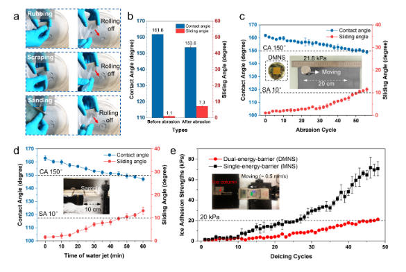 團(tuán)隊采用超快激光分步脈沖注入與化學(xué)氧化復(fù)合的方法,制備出兩組不同類型的微納復(fù)合結(jié)構(gòu),分別對應(yīng)采用納米設(shè)計策略和雙能壘設(shè)計策略的四種超疏水表面。通過一系列防冰與除冰性能測試,發(fā)現(xiàn)相較于傳統(tǒng)的納米效應(yīng)單能壘超疏水結(jié)構(gòu),雙能壘結(jié)構(gòu)具有更高的Cassie穩(wěn)定性和更優(yōu)越的防除冰性能。在-15℃的低溫高濕環(huán)境下可以維持過冷液體不結(jié)冰至少27000s,且冰粘附強(qiáng)度僅為0.9 kPa,在連續(xù)48次連續(xù)除冰循環(huán)后仍能維持~ 20 kpa。同時,團(tuán)隊開展了線性磨損、常/低溫高壓水沖擊等測試,證實了所制備的雙能壘結(jié)構(gòu)可以很好地抵抗外部機(jī)械損傷,并在靜態(tài)和動態(tài)環(huán)境中保持良好的防除冰性能。該工作證實了雙能壘結(jié)構(gòu)設(shè)計對提高超疏水表面Cassie狀態(tài)穩(wěn)定性與耐久性的可行性,為超疏水防除冰表面的設(shè)計及應(yīng)用提供了理論上與技術(shù)上的新路徑。