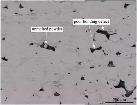 不完全熔合主要是由于LBAM工藝制備過程中缺乏能量輸入而產生的,也稱為缺乏熔合缺陷,如圖5所示。缺乏熔合缺陷主要是因為金屬粉末沒有完全熔化,在前一層上沉積了一層新的金屬粉末,它們之間有足夠的重疊。缺乏熔合缺陷可分為兩種類型:凝固過程中熔融金屬粉末不足形成的粘接不良缺陷和未熔化的金屬粉末造成的缺陷。