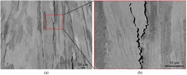 圖 6.(a)LBAM制備316 L不銹鋼裂紋形貌;(b)圖(a)紅色框的放大圖像