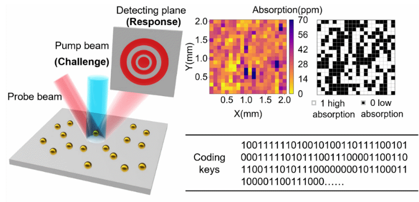 研究人員提出一種利用納米金光熱效應(yīng)制備光學(xué)PUF的新方案。該方案以優(yōu)化熔石英亞表面缺陷的面密度和響應(yīng)強(qiáng)度為起點(diǎn),利用光熱效應(yīng)明顯的金納米顆粒替代亞表面缺陷,生成響應(yīng)對比度足夠高的響應(yīng)信號。通過優(yōu)化制備工藝實(shí)現(xiàn)了金納米顆粒最佳面密度,最大限度地提升了PUF的編碼能力。制備出的光學(xué)PUF不僅滿足了唯一性、可靠性、位均勻性等PUF性能要求,其編碼秘鑰還通過了NIST隨機(jī)數(shù)測試,驗(yàn)證了其隨機(jī)性。該工作為光熱效應(yīng)在光學(xué)PUF上實(shí)現(xiàn)應(yīng)用提供了有力支撐。