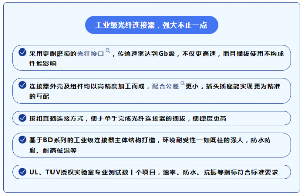 光纖連接器是用于連接光纖的器件,它的作用是將兩根光纖進行連接,實現(xiàn)光信號的傳輸。因而在光纖傳輸領(lǐng)域,光纖連接器的分量也不輕。目前在工業(yè)、醫(yī)療、戶外等嚴苛的應(yīng)用場景下,工業(yè)級的光纖連接器正發(fā)揮著重要的作用,為高速、高可靠、高保真的信號傳輸提供更有力的方案支持。