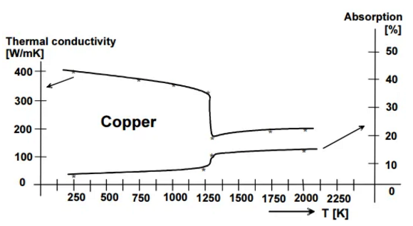圖2 純銅的熱導率及其對1064μm激光吸收率隨溫度的變化趨勢圖[2]