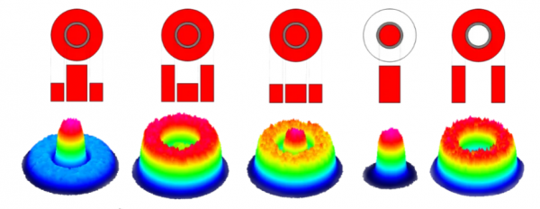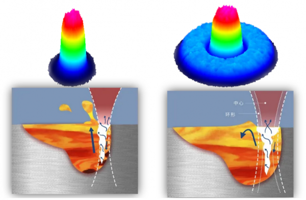 銳科激光旗幟系列R-ABP(Adjustable Beam Profile)光束可調激光器是銳科自研自產的一款焊接利器,能夠有效抑制焊接過程中的飛濺,顯著提高焊接質量和效率,它采用了銳科研發的定制化光纖合束器,通過將不同的光模塊分別獨立的耦合進多芯層光纖的中芯和環芯實現高斯/環形/混合光斑等不同模式的精細化輸出,其技術特點和應用優勢主要包括以下幾點:(1)高可靠性和穩定性:采用高亮度、高冗余、長壽命泵浦源以及低光子暗化、高可靠性涂層有源光纖;(2)多模式組合:可實現雙模擬量控制以單獨控制中芯和環芯功率的輸出和模式的調節,能達到不同模式的毫秒級切換;(3)波形編輯功能:具備P網、E網等總線控制和波形編輯功能,以適應不同的應用控制需求;(4)焊接一致性好:能夠促進熔池穩定、有效抑制焊接飛濺,焊縫成形穩定、一致性好。圖3和圖4分別展示了銳科R-ABP激光器中心光束和環形光束不同模式切換的精細化輸出圖示和穩定熔池抑制飛濺的原理圖示。