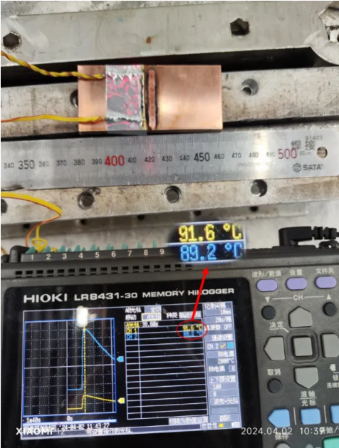 溫度檢測試驗條件:材料選用2片80mm×40mm×3mm的紫銅板進行疊焊;試驗參數為功率6000W+6000W、40mm/s、焊接過程未接保護氣、首尾各安置一路檢測通道、檢測位置距離焊縫中心的距離5mm左右。溫度檢測試驗結果:最高溫度約92℃。如圖6所示為溫度檢測儀器和方法。