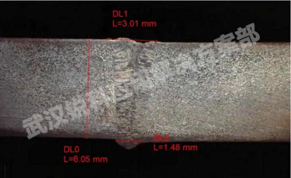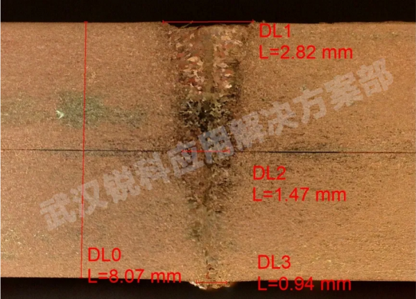 在5800W+5800W激光功率及合適的擺動參數和焊接速度條件下,可獲得焊后表面熔寬2.8mm左右、界面結合處熔寬1.5mm左右和背面熔寬約1.0mm的焊縫成形。圖9為焊縫宏觀形貌及截面金相。