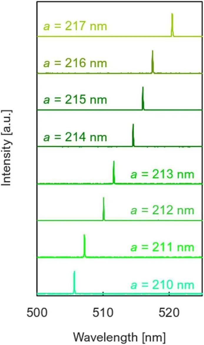 圖2:具有不同光子晶體晶格常數的器件的激光光譜。