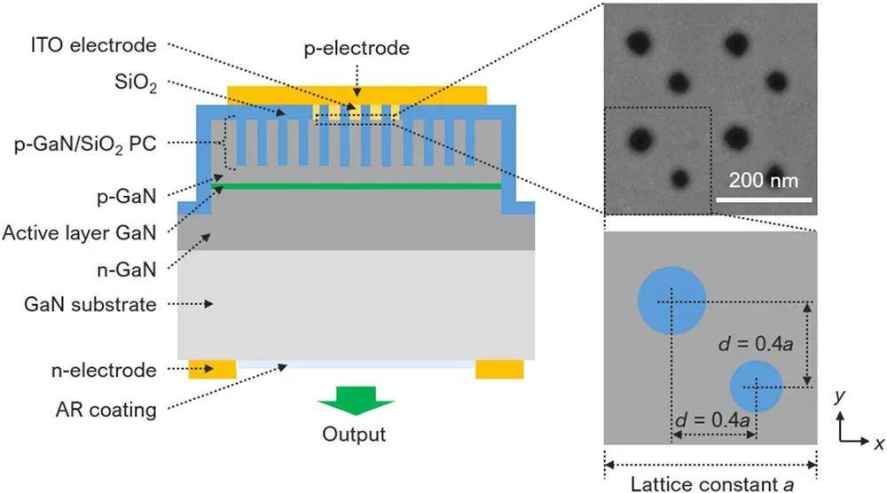 圖1:基于GaN的綠光波長PCSEL的結構:(a)切割芯片的橫截面;(b)(上)去除ITO電極后,p-GaN表面光子晶體的掃描電子顯微鏡(SEM)圖像;(下)雙晶格光子晶體設計方案。