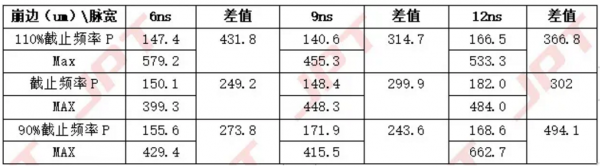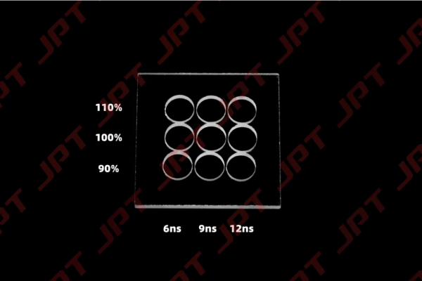 ①脈沖寬度對玻璃鉆孔的影響 下面是對超白玻璃進行鉆孔實驗,圓的孔徑大小為10mm,厚度為3mm,分別采用6ns模式,9ns模式,12ns模式對應的截止頻率測試脈寬對玻璃切割的影響。 圖1 不同脈寬和頻率切割的效果
