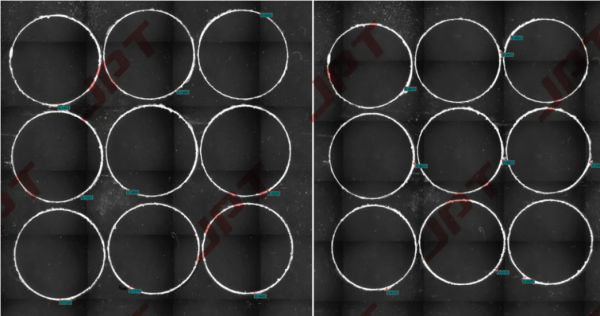 下圖展示了使用YDFLP-200-M8-S-W-V2激光器異形鉆孔效果,崩邊均小于400微米,邊緣效果優異。