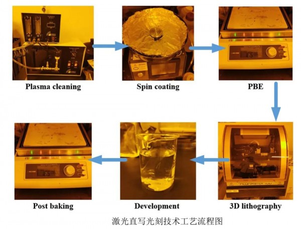 這些技術具體包括有襯底表面處理技術、光刻膠旋涂技術、光刻膠前烘技術、激光直寫光刻曝光技術、顯影以及后烘(PBE)技術。具體的流程如下圖所示。