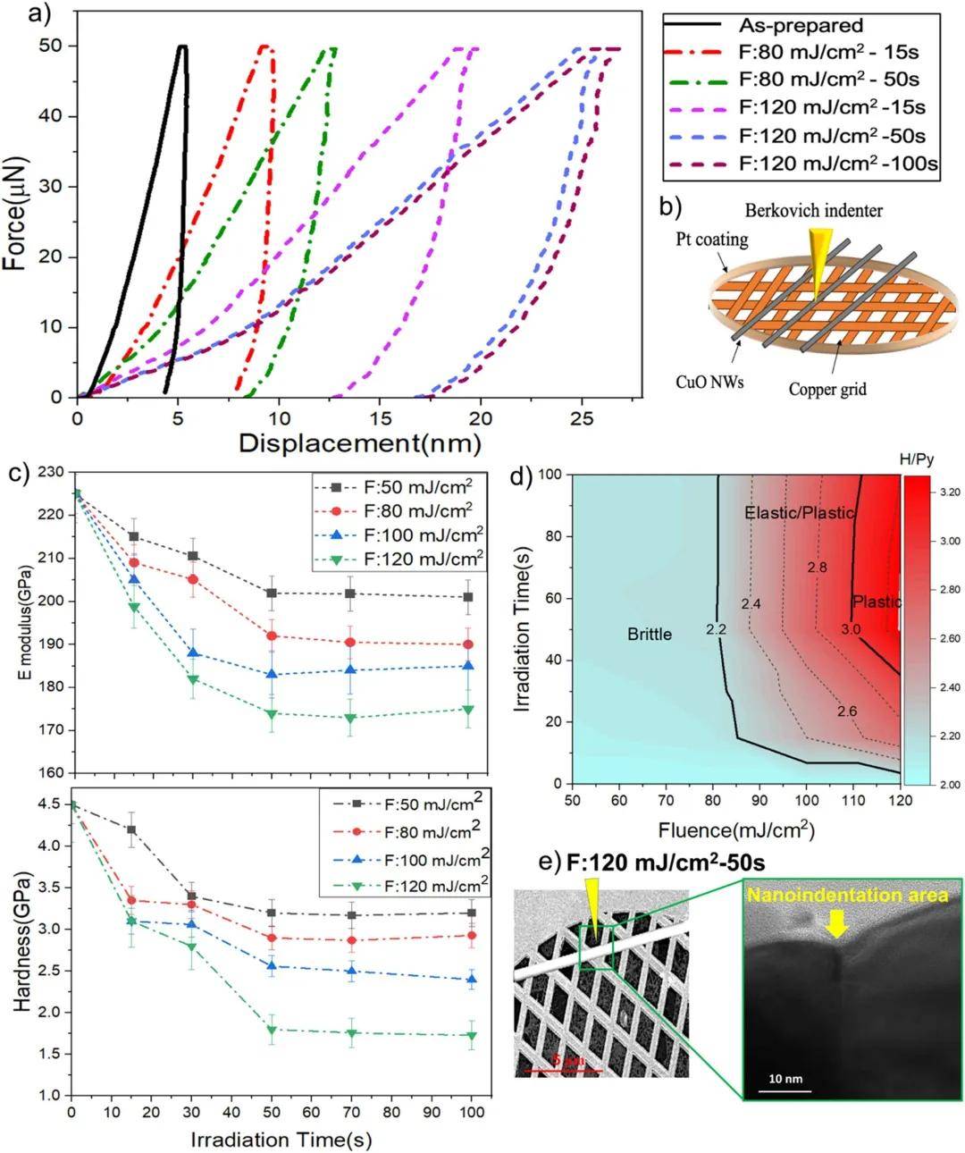 圖 5.原始和激光加工過的氧化銅納米線樣品的納米壓痕測試實驗裝置和結(jié)果。