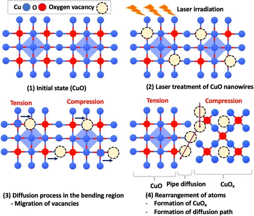 5.飛秒激光通過產(chǎn)生缺陷增強(qiáng)氧化銅納米線的可塑性。