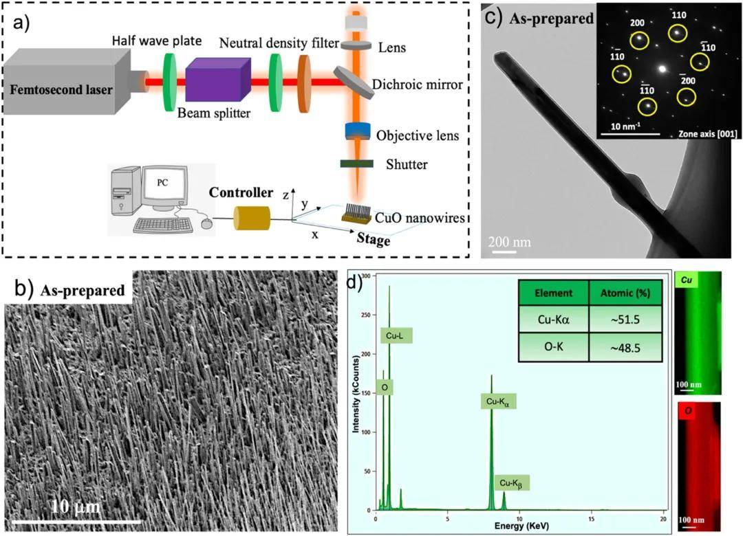 圖 1:a)飛秒脈沖激光輻照裝置示意圖;b)所制備納米線薄膜取向良好、垂直排列的SEM圖像;c,d)所制備單晶單斜CuO納米線的明場TEM 圖像,以及相應(yīng)的SAD圖樣和EDS分析。