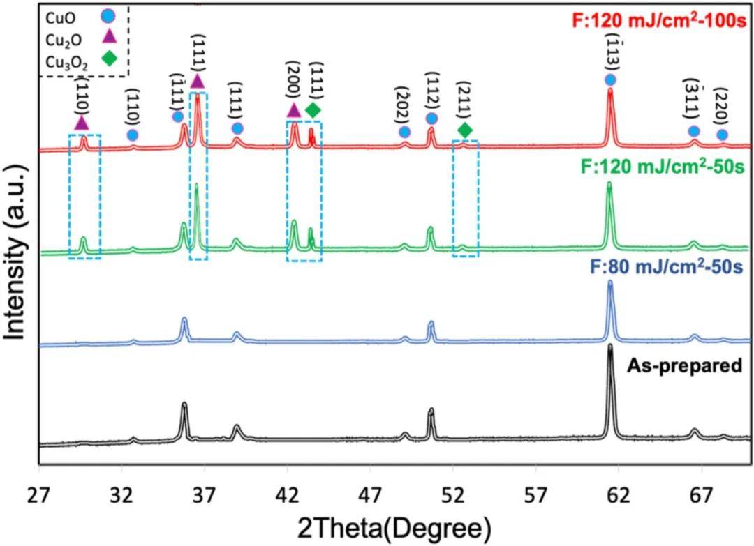 圖 4.XRD分析追蹤激光加工氧化銅納米線試樣相對于未加工試樣的結(jié)構(gòu)變化。