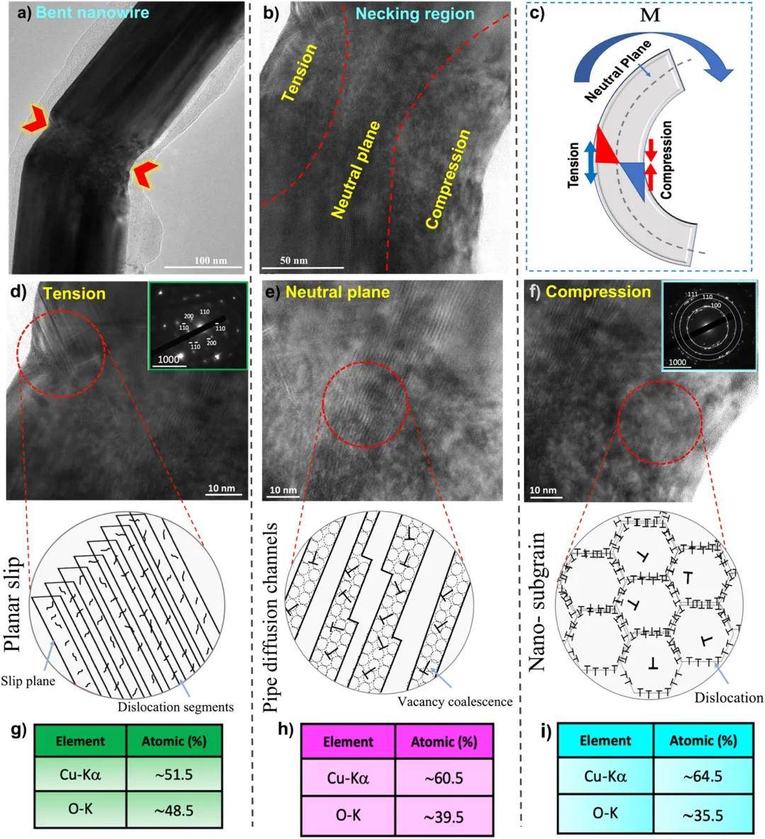 圖 7.飛秒激光輻照后CuO納米線在彎曲過程中頸縮區(qū)域內(nèi)的亞結(jié)構(gòu)演變示意圖。
