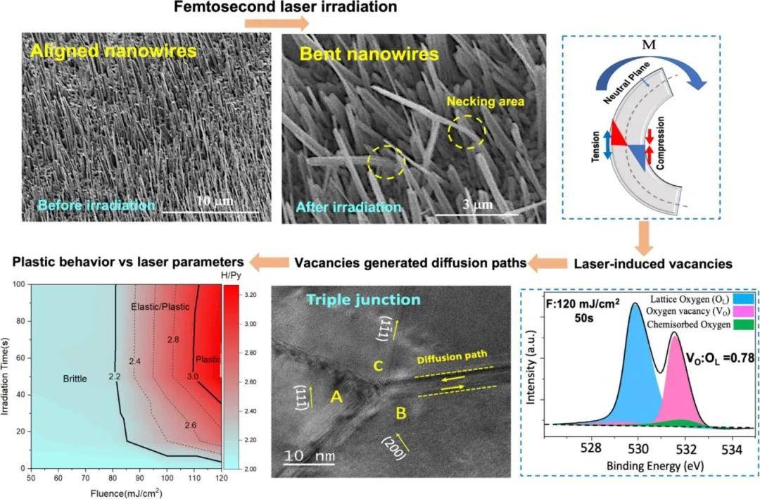 金屬氧化物納米線是制造納米器件(尤其是應(yīng)變傳感器)的理想材料。然而,這些材料的固有脆性限制了其應(yīng)用。科研人員證明,通過飛秒激光輻照進(jìn)行二次處理,可以解決這一限制。科研人員的研究表明,氧化銅納米線在室溫下的力學(xué)性能可以調(diào)節(jié),以減少脆性破壞并增強(qiáng)塑性。科研人員利用透射電子顯微鏡圖像研究了飛秒激光處理誘導(dǎo)塑性的微觀機(jī)制。在適度的激光輻照強(qiáng)度下,這種處理方法通過產(chǎn)生更高密度的氧空位來誘導(dǎo)氧化銅納米線的塑性,從而使納米線的構(gòu)型從斷裂變?yōu)閺澢T趶澢募{米線中,由于高應(yīng)變率,空位從彎曲拉伸區(qū)遷移到壓縮區(qū),導(dǎo)致局部激光誘導(dǎo)氧化銅向缺氧成分相變。飛秒激光誘導(dǎo)的氧空位凝聚為擴(kuò)散機(jī)制的激活鋪平了道路,而擴(kuò)散機(jī)制反過來又促進(jìn)了位錯運動,從而導(dǎo)致了亞結(jié)構(gòu)的發(fā)展。此外,納米壓痕分析還進(jìn)一步證明了飛秒加工納米線具有類似金屬的塑性行為。這一結(jié)果可用于提高納米線在未來應(yīng)用中的性能。