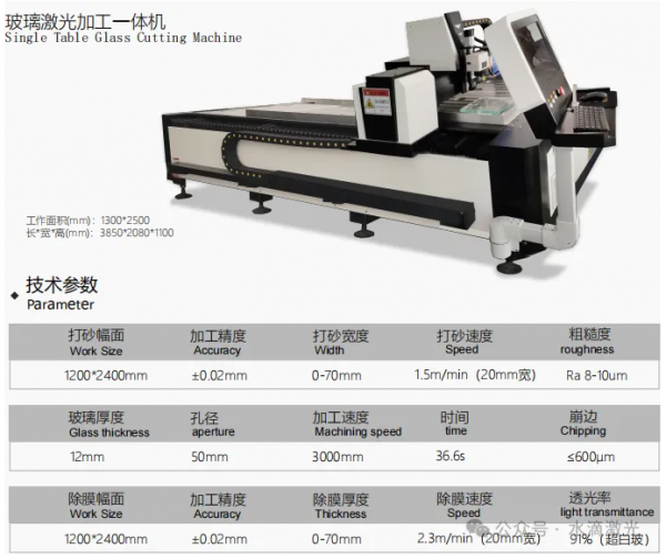 設備集成一體化加工,除了激光打砂外、還可用于激光除膜、激光打孔、激光刻蝕等多種工藝的玻璃加工中: