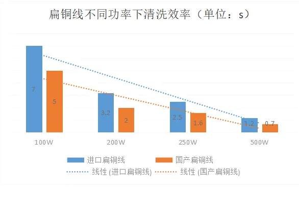 由三組實(shí)驗(yàn)可得,不同功率段均可以進(jìn)行扁銅線清洗,且能達(dá)到相近的工藝效果,但清洗節(jié)拍相差較大。當(dāng)將激光器功率調(diào)整的百分比越大,清洗效率更快,清洗次數(shù)也更少,可以更好的滿足高生產(chǎn)節(jié)奏要求。客戶可根據(jù)自身要求,調(diào)節(jié)工藝參數(shù)選擇合適的生產(chǎn)節(jié)拍。2、不同功率激光器清洗扁銅線,旗幟系列P500MX效率最高,僅1s內(nèi)扁銅線從來(lái)源上可分為進(jìn)口和國(guó)產(chǎn)兩種,本次實(shí)驗(yàn)我們采用了進(jìn)口和國(guó)產(chǎn)的相同材料的扁銅線,兩者主要差別為表面漆層不同,其中國(guó)產(chǎn)扁銅線厚度為0.08mm,進(jìn)口扁銅線為0.13mm。我們同時(shí)采用4種不同功率的脈沖激光器(RFL-P100MX/RFL-P200S/RFL-P250MX/RFL-P500MX-R)分別對(duì)進(jìn)口和國(guó)產(chǎn)相同材料的扁銅線進(jìn)行最佳效率的測(cè)試,清洗尺寸為30mm*5mm。結(jié)果如下圖3,我們可以得出,清洗同一類型的扁銅線,隨著功率的增加,清洗效率也進(jìn)一步得到提升;而采用同一激光器分別清洗進(jìn)口和國(guó)產(chǎn)的扁銅線,清洗國(guó)產(chǎn)扁銅線效率高于清洗進(jìn)口扁銅線效率;其中,使用旗幟系列P500MX激光器清洗效率最高,進(jìn)口扁銅線的清洗效率為1.2s,國(guó)產(chǎn)扁銅線的清洗效率為0.7s。由此表明,采用P500MX激光器進(jìn)行扁銅線的清洗,效率可控制在1s左右。相對(duì)于P100MX激光器,提升超過5倍,大大提高了生產(chǎn)節(jié)拍。圖4為測(cè)試的進(jìn)口和國(guó)產(chǎn)扁銅線效果圖,表面漆層不同,不同功率下均可完全清洗干凈。