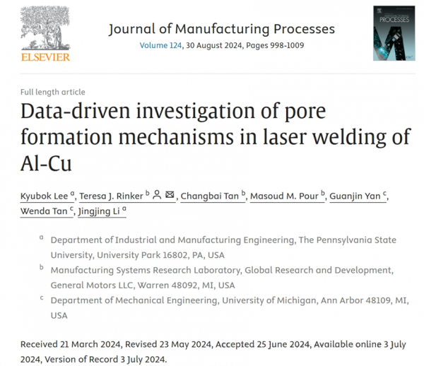 來自美國的研究團隊Kyubok Lee等人在Journal of Manufacturing Processes國際雜志上發表文章Data-driven investigation of pore formation mechanisms in laser welding of Al-Cu。