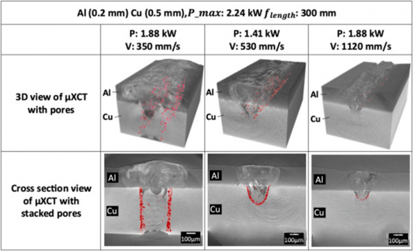 異種金屬的激光焊接因為其復雜的物理現象,使我們在探索氣孔的形成機理時面臨更大的挑戰。該研究采用數據科學、三維圖像分析和計算流體動力學相結合的多學科方法,探討了Al-Cu搭接接頭激光焊接中的氣孔形成機理。顯微X射線計算機斷層掃描成像顯示了激光焊接樣品中氣孔的三維形態和位置數據,隨后對這些數據進行區分得到三種不同的氣孔類型,即熔合區氣孔、小熔合邊界氣孔和大熔合邊界氣孔。在這些數據的支撐下,該研究通過計算流體動力學模擬更深入地研究氣孔形成機理,模擬了氣泡的運動及其與熔池的復雜相互作用,為不同氣孔類型的控制機制提供了見解。進一步探究了工藝參數對氣孔形成機理的影響,揭示了工藝參數對Al-Cu異種金屬激光焊接中氣孔形成的影響。