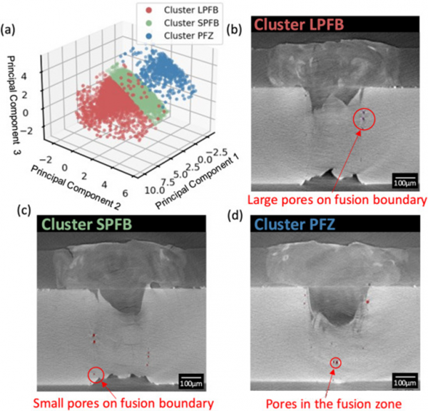 圖4. 氣孔團聚結果:(a)主成分1和主成分2的團聚分布;(b)、(c)、(d)最具代表性的分別是團簇LPFB(熔合邊界大氣孔)、團簇SPFB(熔合邊界小氣孔)和團簇PFZ(熔合區域內氣孔)。