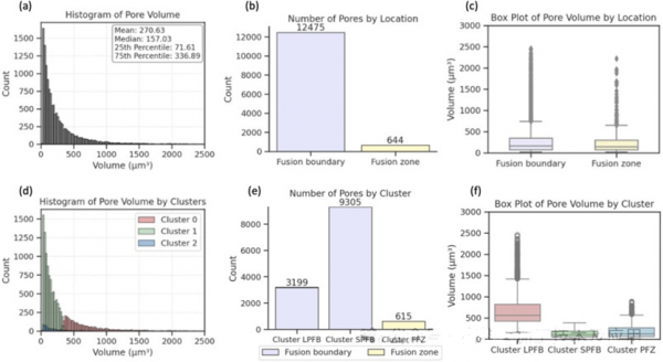 正態分布,表明數據集中在較小的氣孔(圖6(a))。圖6(b)和(c)顯示了基于氣孔位置(熔合邊界或熔合區)的氣孔數量和體積分布。融合邊界處的氣孔數量明顯高于在融合區觀察到的氣孔數。此外,氣孔位置對體積影響不顯著。圖 6(d)表示每個聚類的體積直方圖,顯示每個聚類保持左偏態對數正態分布。數據也表明,團簇LPFB和SPFB根據氣孔體積有明顯的區分,而團簇PFZ則具有獨立的分布。圖 6 (e) 顯示了每個簇中分類的氣孔數量及其位置。數據顯示,聚集在PFZ簇中的大多數氣孔源自位于融合區的氣孔,而簇LPFB和SPFB則由位于融合邊界的聚集氣孔組成。圖6(f)顯示了每個團簇的氣孔體積分布。觀察到 LPFB 和 SPFB 簇之間的體積分布存在明顯差異,表明它們基于體積和大小特征的區別。