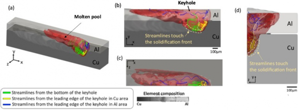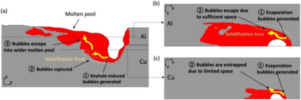 圖7. Al-Cu激光焊接中的氣孔生成機理:(a)Al區域的縱向截面視圖,(b)Al區域的水平截面視圖,(c)Cu區域的水平截面視圖。