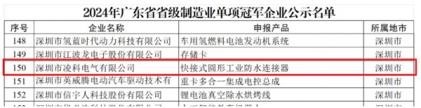近日,廣東省工業和信息化廳公布了《2024年廣東省省級制造業單項冠軍企業名單》,在357家榮獲此榮譽的企業中,深圳市凌科電氣有限公司因其出色的“快接式圓形工業防水連...