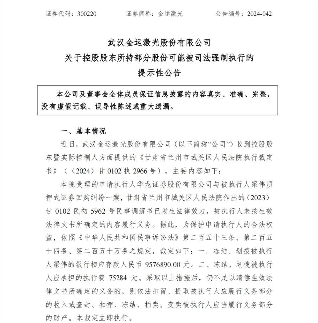 8月7日,金運激光公告,公司控股股東梁偉所持部分股份存在被司法強制執(zhí)行的風(fēng)險。梁偉持有公司35.85%股份,其中4.35%股份已被凍結(jié)。如被凍結(jié)股份被執(zhí)行,不會導(dǎo)致公司控...