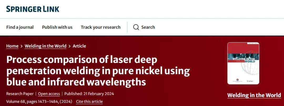 據悉,德國BIAS-Bremer Institut für angewandte Strahltechnik GmbH的科研人員報道了使用藍光和紅外光線波長對純鎳進行激光深熔焊接的工藝比較研究。相關研究以“Process comparison of laser deep penetration welding in pure nickel using blue and infrared wavelengths”為題發表在《Welding in the World》上。