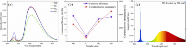 圖3. 基于3 at% Ce3+ 濃度的Al2O3–Ce: (Y, Tb)3(Al, Mn)5O12復(fù)合相熒光陶瓷的WLED (a)和WLD (b)(c)性能
