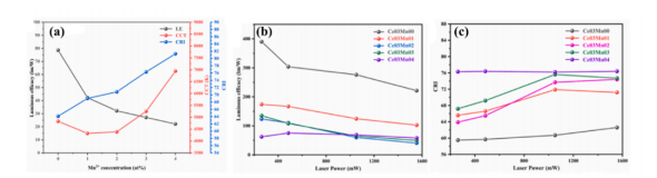 圖2. MgO- YMASG: Ce熒光粉陶瓷的白光LED發(fā)射光譜 (a)、發(fā)光效率和色溫 (b)以及30 at% MgO樣品的白光LD發(fā)射光譜 (c)