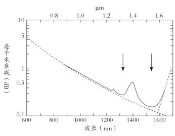 由于數值范圍非常大,圖2顯示了光纖中衰減損耗的模式。最低損耗值出現在波長接近 1.5 微米的位置,此時曲線出現最低波谷。早期的光纖只傳輸波長接近 1.3 微米的光,這受限于當時的光源和探測器選擇,這個波段的光損耗也出現了一個波谷。現代材料比這里使用的示例更加透明。兩個波谷之間出現吸收波峰,源于纖維中殘余水的作用。圖上的曲線變化很明顯,但我們需要記住,影響因素是雜質(比如水),它可能只占玻璃的百萬分之幾。即使在損耗最大的波長下,它仍然是一種非常透明的玻璃,但我們要研究每千米的損失,而不僅僅是窗玻璃的厚度。