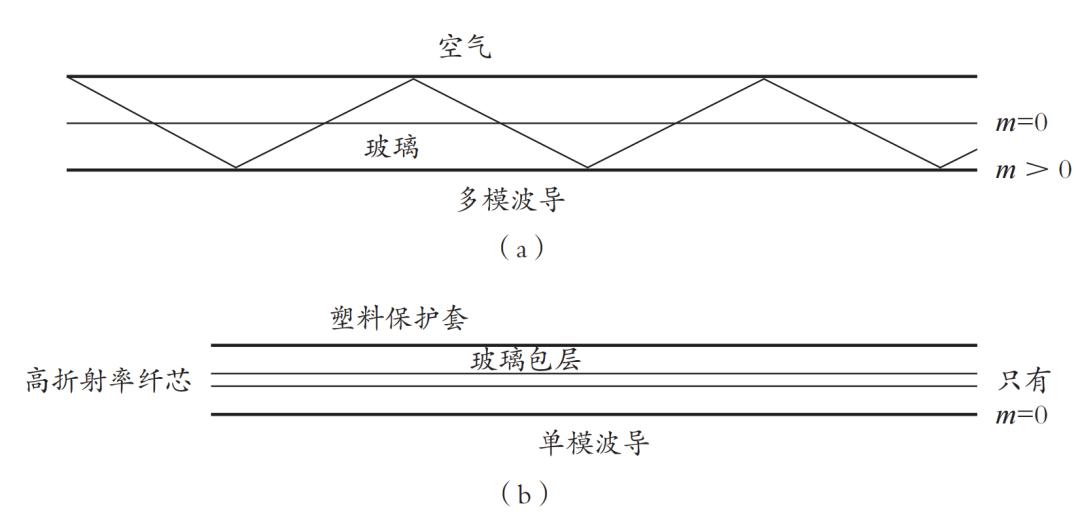 圖1 光可以在一塊玻璃或光纖內彈跳。如果與光的波長相比,光纖的纖芯較大,則有多個可行的彈跳角度,稱為模,寫為 m=0、m=1、m=2 等。此處為了顯示效果而夸大了角度。對于通信光纖,高折射率纖芯往往非常小,因此實際上光只能以一種模式沿光纖直線傳播。