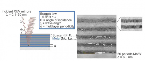 ASML光刻機中的布拉格反射器由蔡司研發,采用硅和鉬作為主要原料,超過40層介質層,每層的厚度只有不到4納米,而鍍膜的精度誤差不超過0.05納米,鍍膜技術由德國弗勞恩霍夫應用光學與精密機械研究所提供。通過精確控制介質的厚度和組合,原本四散射出的極紫外線就可以集合起來,匯聚為一束強的光線用于生產。