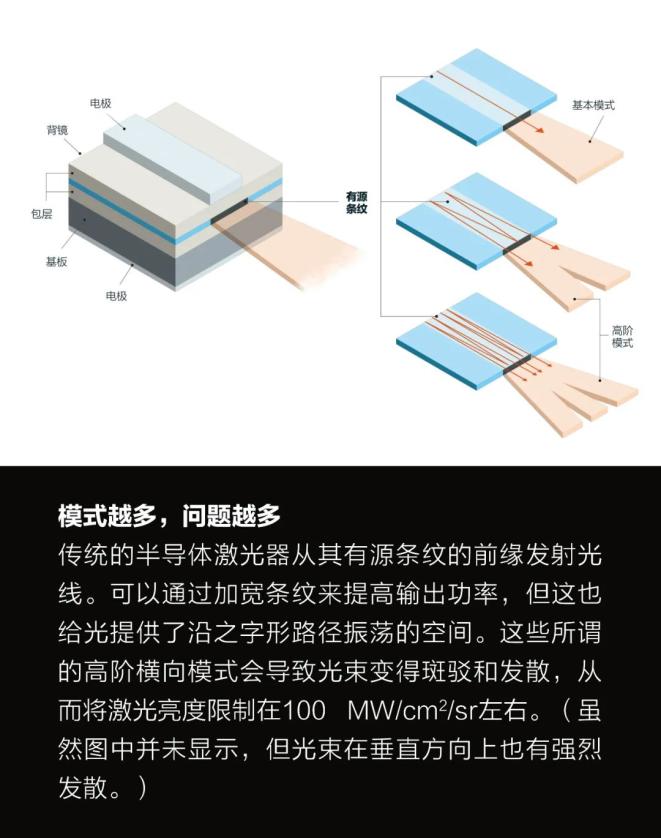 這種標準條紋方法的問題在于,它很難在不犧牲光束質量的情況下提高輸出功率。極度集中的光線會對半導體造成災難性的破壞,因此半導體激光器的功率受其發射面積的限制。通過加寬條紋可以實現更大功率,這便是所謂的寬面積激光器所使用的策略。但更寬的條紋也為振蕩光提供了走之字形側向路徑的空間,從而形成所謂的高階橫向模式。