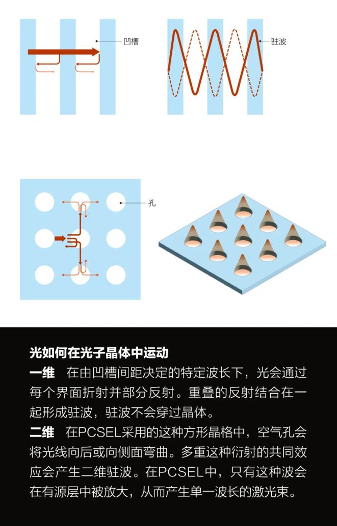 其工作原理如下:當該長度的波在有源層中產生時,鄰近光子晶體層中的孔就像微小的鏡子一樣,將光向后或向側面彎曲。多重這種衍射的共同效應會產生二維駐波,然后被有源層放大。其中一些振蕩光還會向上和向下衍射,并從激光器的頂部漏出,產生單一波長的表面光束。