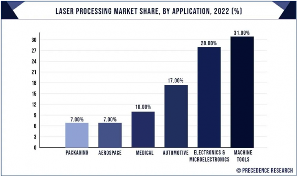 近日,根據(jù)Precedence Research發(fā)布報告稱,2023年全球激光加工市場規(guī)模為222.7億美元,并預計2024年將增至240.2億美元。激光加工市場的驅(qū)動力來自于激光技術(shù)的普遍進步,如光纖激光器、二極管激光器和超快激光器的發(fā)展,這些技術(shù)有助于提高效率、性能和多功能性。在預測期內(nèi),亞太地區(qū)將占據(jù)激光加工領(lǐng)域的大部分市場份額。這是因為各種激光技術(shù)越來越多地應用于微電子和機床領(lǐng)域。此外,建筑、航空航天和國防等垂直行業(yè)對激光系統(tǒng)的需求也在不斷增長,包括在打標、雕刻和材料加工等復雜耗時的操作中采用激光技術(shù)所帶來的巨大優(yōu)勢。亞洲各國政府紛紛實施扶持政策和舉措,促進制造業(yè)發(fā)展并鼓勵采用包括激光加工在內(nèi)的先進技術(shù)。電子、醫(yī)療保健和消費品等快速增長的行業(yè),是激光加工技術(shù)的重要消費市場,有助于提高市場份額。在預測期內(nèi),材料加工領(lǐng)域?qū)⒅鲗袌觥T摷毞质袌龅臄U大歸因于各種材料的多功能性和對環(huán)境的關(guān)注。激光加工因其在加工金屬、陶瓷、玻璃、復合材料和塑料等各種材料方面的多功能性而聞名。激光系統(tǒng)處理各種材料的能力,使其成為汽車、電子、航空航天和醫(yī)療保健等多個行業(yè)不可或缺的設備。這就是為什么激光加工因多功能性而被視為材料加工應用的首選解決方案。與傳統(tǒng)方法相比,激光加工對于材料的浪費更少,對環(huán)境的影響更小。隨著可持續(xù)發(fā)展成為制造業(yè)的首要關(guān)注點,各行各業(yè)紛紛轉(zhuǎn)向激光加工,以減少材料浪費、環(huán)境影響和能源消耗。過去兩年,機床細分市場占據(jù)了最大的市場份額,預計在預測期內(nèi)將繼續(xù)占據(jù)大部分市場份額。機床與激光技術(shù)相結(jié)合,可以實現(xiàn)精確切割、焊接和雕刻。這種精度在航空航天、汽車和電子行業(yè)中至關(guān)重要,因為這些行業(yè)對精確測量和微小細節(jié)要求極高。隨著技術(shù)的進步,機床在激光加工市場上的競爭力也越來越強。希望采用激光加工解決方案的企業(yè)會發(fā)現(xiàn),由于機床成本的降低和性能的提高,激光加工解決方案在經(jīng)濟上是一種可行的選擇。激光加工需要制造具有精確標準和嚴格公差的優(yōu)質(zhì)部件,因此對精密制造的需求不斷增長,預計激光加工的需求也將隨之增長。它有多種用途,包括處理材料、最大限度地減少熱影響區(qū)以及提供精確的焊接或切割程序控制。隨著汽車、航空航天、電子和醫(yī)療設備等行業(yè)越來越重視制造精度,對激光加工技術(shù)的需求也隨之增加。由于激光系統(tǒng)具有適應性強、可完成復雜任務的能力,因此對于滿足當代精密生產(chǎn)的高要求至關(guān)重要。例如,先進金屬快速成型制造領(lǐng)域的領(lǐng)導者ADDiTEC公司推出了AMDroid和Hybrid3兩種尖端生產(chǎn)平臺,有望在精度、效率和適應性方面顛覆行業(yè)標準。暴露于激光輻射會導致眼睛損傷、皮膚灼傷和其他健康問題,因為激光會釋放出強大的輻射,如果不加以適當控制,會對工人造成危險。遵守職業(yè)健康安全規(guī)則對于保護使用或靠近激光加工設備的人員至關(guān)重要。激光加工產(chǎn)生的煙霧、氣體和顆粒物質(zhì)會對肺部造成危害。職業(yè)健康和安全標準規(guī)定了排放控制和高效通風系統(tǒng),以減少接觸有害副產(chǎn)品的機會。這些都是阻礙激光加工市場進一步擴大的因素。激光加工市場為應用領(lǐng)域的多樣化提供了巨大的可能性。除切割、焊接和雕刻這些應用之外,越來越多的企業(yè)和領(lǐng)域開始使用激光。激光技術(shù)的發(fā)展提高了激光的成本效益、效率和多功能性,從而實現(xiàn)了多樣化。激光被用于醫(yī)療行業(yè)的精確手術(shù)、檢查和治療。在通信領(lǐng)域,激光是光纖網(wǎng)絡數(shù)據(jù)傳輸?shù)年P(guān)鍵。此外,激光還用于汽車行業(yè)的焊接和切割,并有助于消費電子產(chǎn)品的激光打標和雕刻。新型材料和生產(chǎn)工藝的引入,也將進一步擴大激光的應用范圍。由于激光在增材制造、3D打印甚至文化遺產(chǎn)保護等尖端行業(yè)中的應用日益廣泛,因此也帶來了新的發(fā)展機遇。隨著多個行業(yè)對精確有效的加工方法的需求不斷增加,激光加工市場將從廣泛的應用中獲得巨大收益,促進創(chuàng)新并創(chuàng)造經(jīng)濟機會。- 微電子市場:2022年全球微電子市場規(guī)模為3250億美元,預計到2032年將超過4741.7億美元,2023-2032年的復合年增長率為3.90%。