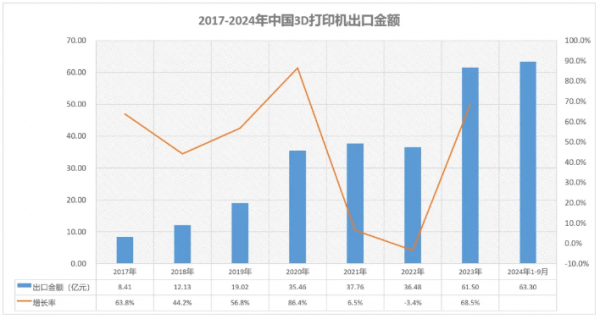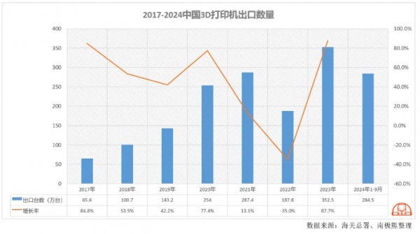 前三季度的出口3D打印機臺數已經開始接近去年全年的量,按照前三季度的數據推測,2024年全年3D打印機的出口數量有望達到400萬臺,比去年全年增長13%左右。在出口3D打印機的金額方案,前三季度達到63.3億元,已經超越了去年的總金額。全年預計在80億元-100億元之間。