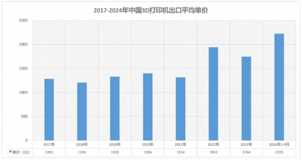 國產3D打印機的平均價值保持了不斷提高的趨勢,2024年前三季度出口的3D打印機平均單價為2225元/臺,首次突破了2000元/臺的大關。這在一定程度上體現了國產3D打印機正在從低端的組裝,走向相對高端的自主研發,產品競爭力和議價能力正在加強。